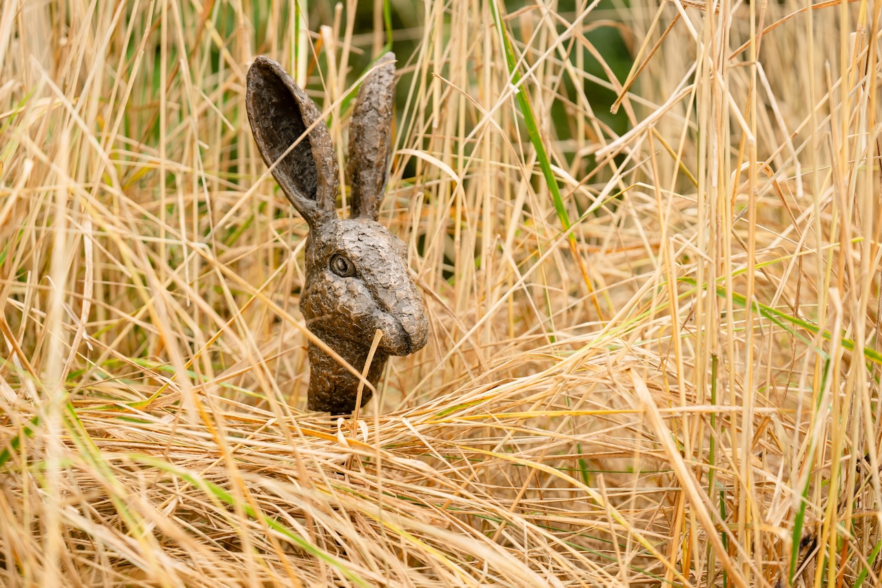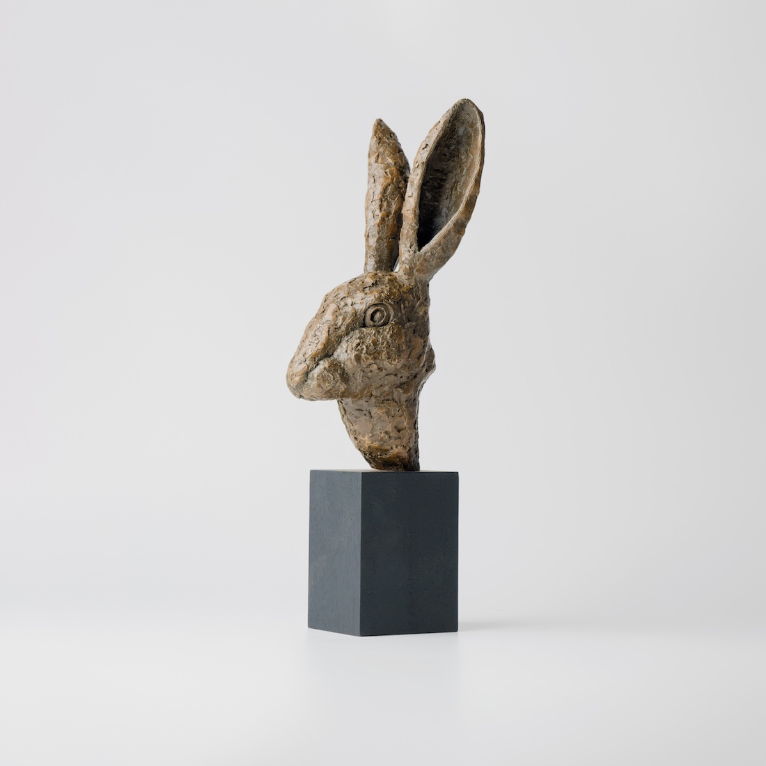 This Hare portrait define the character of a hare on alert. It can be outdoor in a garden behind a bush or on a plinth or indoor on a block of wood.